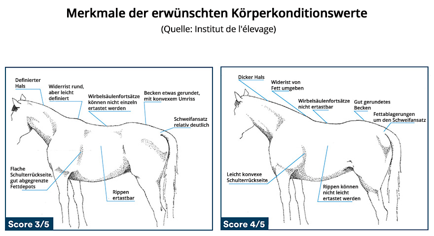 Wissenschaftliche Studien haben gezeigt, dass die beste Fruchtbarkeit bei Stuten mit einer Körperkondition zwischen 3 und 4 (Caroll und Huntington) bzw. zwischen 5 und 7 (Henneke) erreicht wird. Die Merkmale, die sich auf Konditionswerte von 3 und 4 beziehen, sind in Bild "Merkmale der erwünschten Körperkonditionswerte" beschrieben.